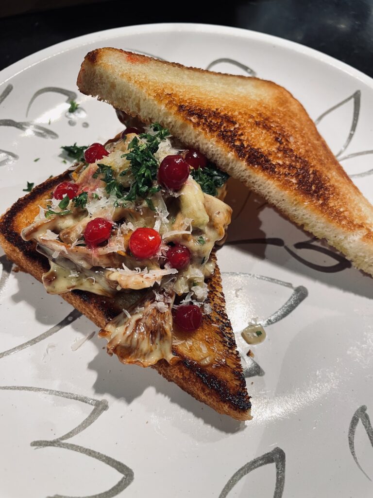 7. Fördela svampröran på bröden. Toppa med parmesan och persilja.