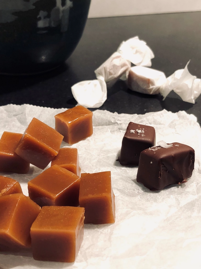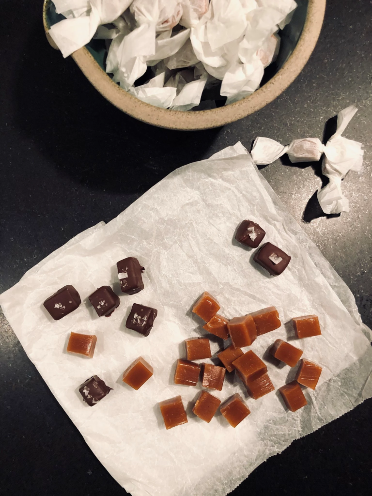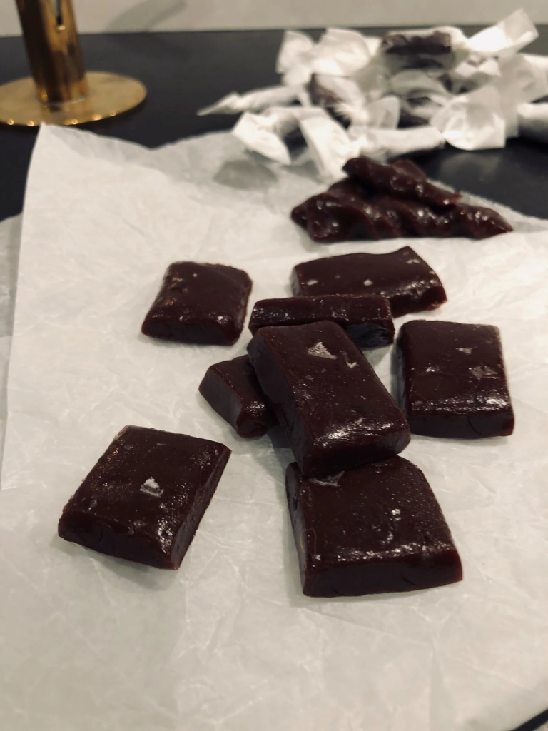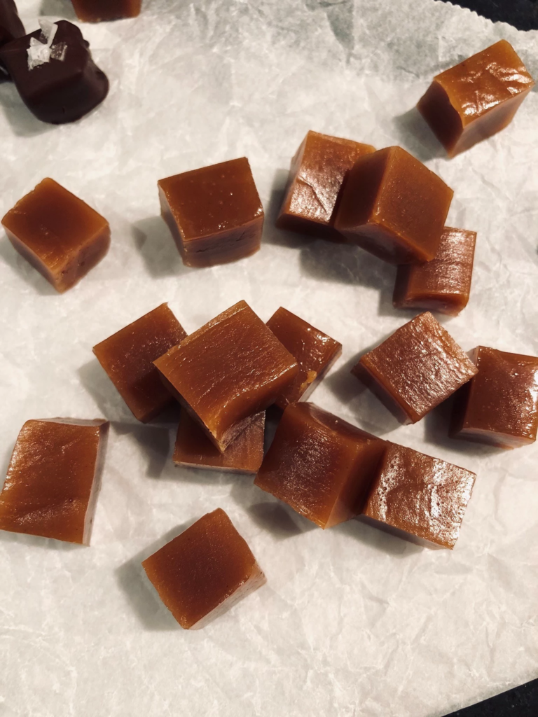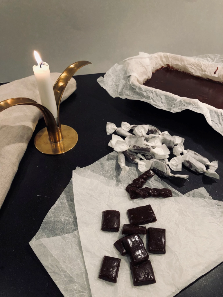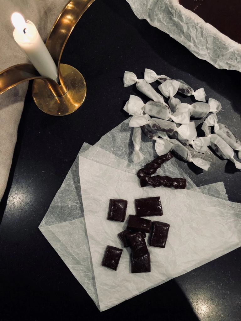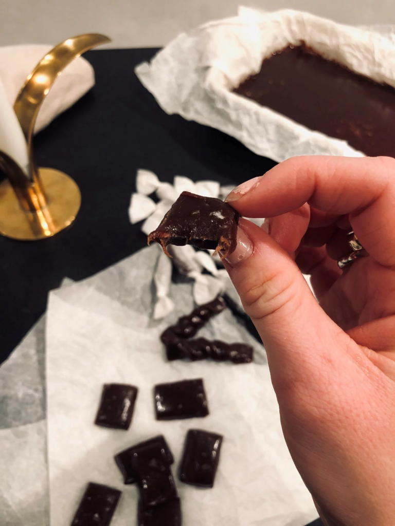 5. Låt sedan stelna innan du skär den i bitar i önskad storlek. Paketera in i bakplåtspapper/smörpapper. Vill du kan du även doppa några kolor i choklad och toppa med lite flingsalt. Jag rekommenderar då att du tempererar chokladen för snyggast resultat.