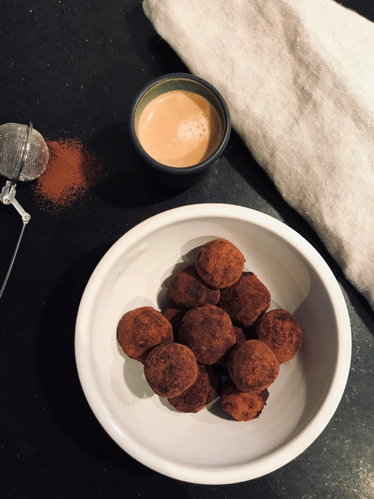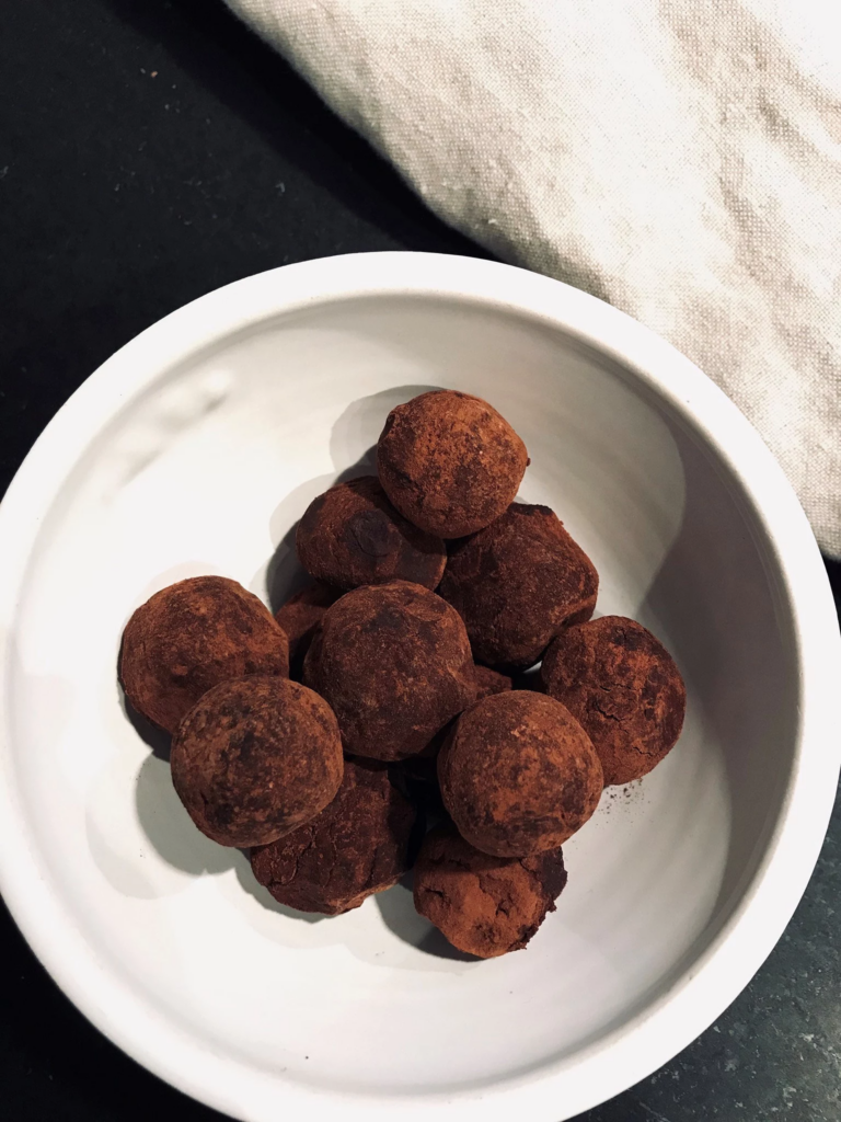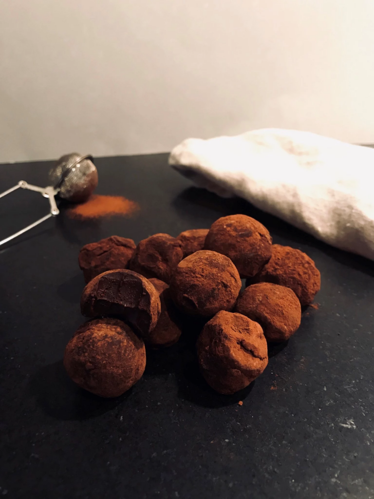 6. Forma sedan till bollar och avsluta med att rulla i kakao. (Tips: doppa händerna i kakao innan du börjar rullar bollarna så minimerar du risken att bli allt för kladdig…)
